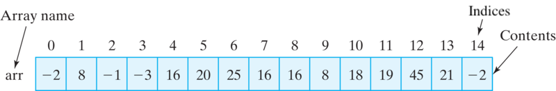 The figure below shows an array named arr that contains 15 int elements. The syntax for referring to elements of an array is arr[i], where i is the index of the element.
